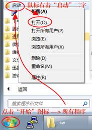 創建一個快捷方式。點擊桌面左下角“開始”圖標 -- 所有程序 -- 鼠標右擊“啟動” -- 打開,將前面創建