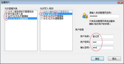 勾選3個數據庫項目為允許查看,允許修改的僅為“收文登記錄入管理庫”;創建用戶“辦文員1”、