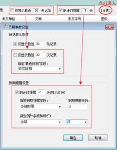 設置“到期提醒”:在主界面上點擊最上面的【設置】小按鈕,進入日期參數設置界面可以設置到期