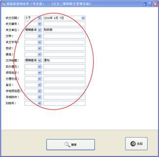 公文登記錄入數據庫后,可選擇組合查詢條件檢索數據庫內記錄,以便查詢公文辦理情況。查詢條件