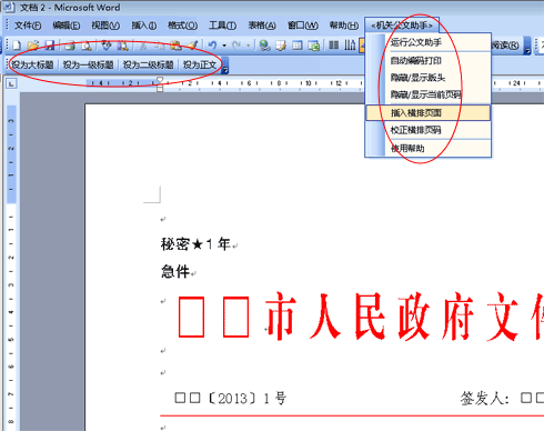 隱藏/顯示版頭:切換發(fā)文機(jī)關(guān)標(biāo)識(shí)和紅色反線的顯示狀態(tài),主要是便于用彩色打印機(jī)直接打印和用紅頭文件紙?zhí)子〈蛴 ?br />